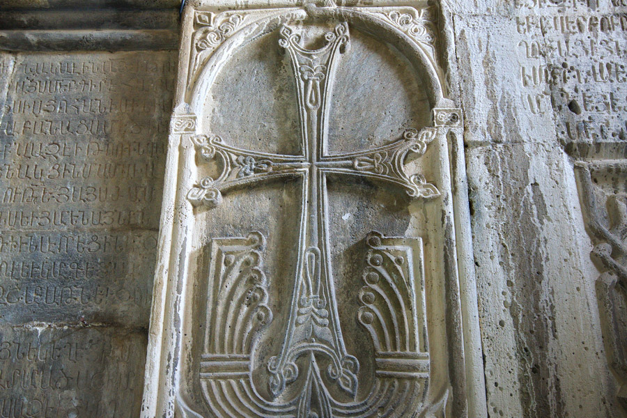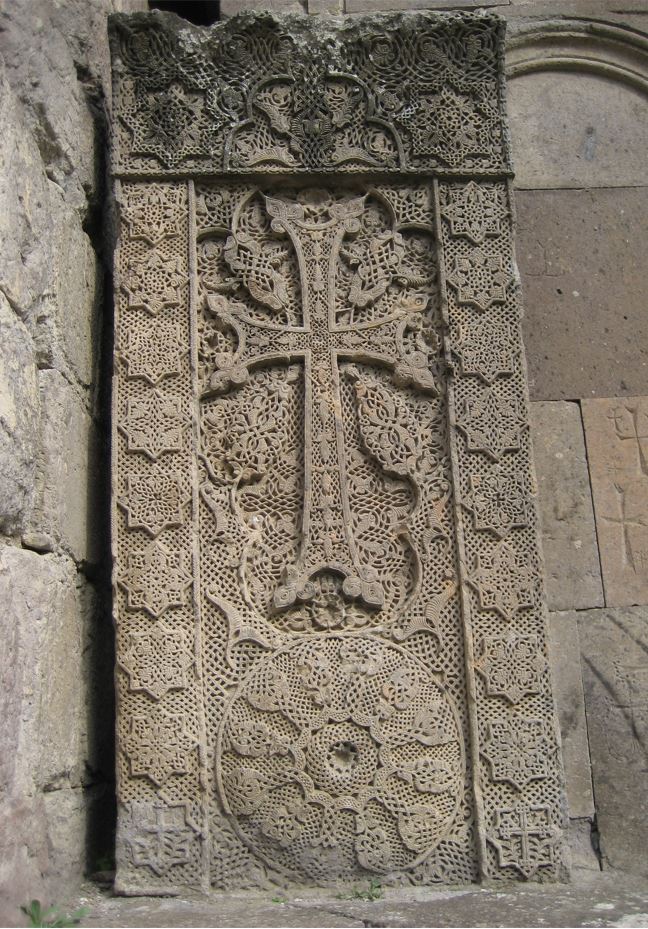 The Armenian cross-stone - Khachkar, is a carved, memorial stele bearing a cross, and often with additional motifs such as rosettes, interlaces, and botanical motifs. Khachkars are characteristic of Medieval Christian Armenian art. The first khachkar dates back to 879 CE (in Garni), already contained the main symbolic elements of cross-stone.