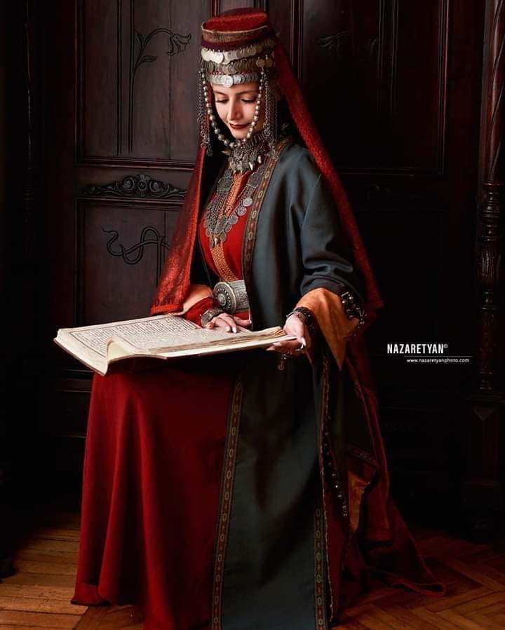 Armenians have a very diverse national dress. The Armenian national costume (taraz), also known as the Armenian traditional clothing, reflects a rich cultural tradition. Wool and fur were utilized by the Armenians along with the cotton that was grown in the fertile valleys. The Armenian national costume has existed through long periods of historical development. The Armenian national costume is dominated by the colors of the four elements: earth, water, air, and fire. According to the 14th century Armenian philosopher Grigor Tatevatsi, the Armenian costume is made to express the ancestral soil, the whiteness of the water, the red of the air, and the yellow of the fire. Apricot symbolizes prudence and common sense, red symbolizes courage and martyrdom, blue symbolizes heavenly justice, white symbolizes purity. The Armenian national costume is accented with silver necklaces and bracelets. The final element of the costume is the headdress.